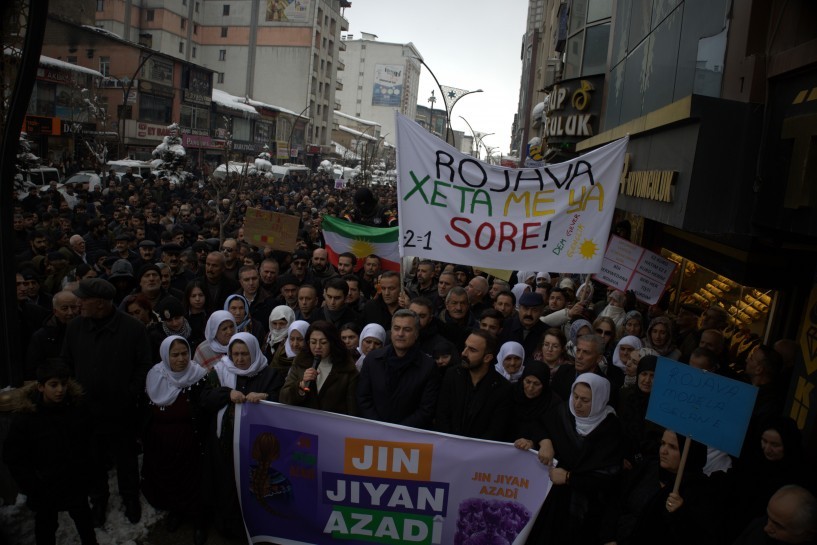 Rojava’ya dönük saldırılara karşı Gever’de düzenlenen yürüyüşte, ‘Kürt halkını bu komplo ile bitirmek istiyorlardı ama Kürtler direndiler ve bunu boşa çıkardılar. Kürtler kazanımlarını koruyacak ve asla bundan vazgeçmeyecekler’ denildi