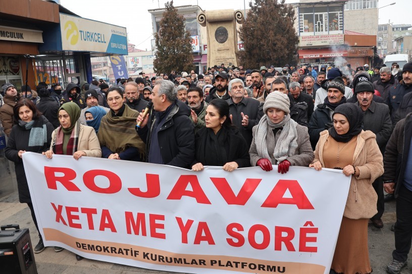 Demokratik Kurumlar Platformu (DEKUP) öncülüğünde Rojava’ya dönük saldırılara karşı Mêrdîn’in Artûklu ilçesinde basın açıklaması gerçekleştirdi. İstasyon Mahallesi’nde gerçekleşen açıklamaya, siyasi parti temsilcisi, sivil toplum örgütü üyelerinin yanı sıra çok sayıda kişi katıldı. Açıklamada, “Rojava vicdandır, özgürlüktür, direniştir teslim alınamaz” yazılı pankart taşınırken sık sık “Bijî Berxwedana Rojava” sloganları atıldı