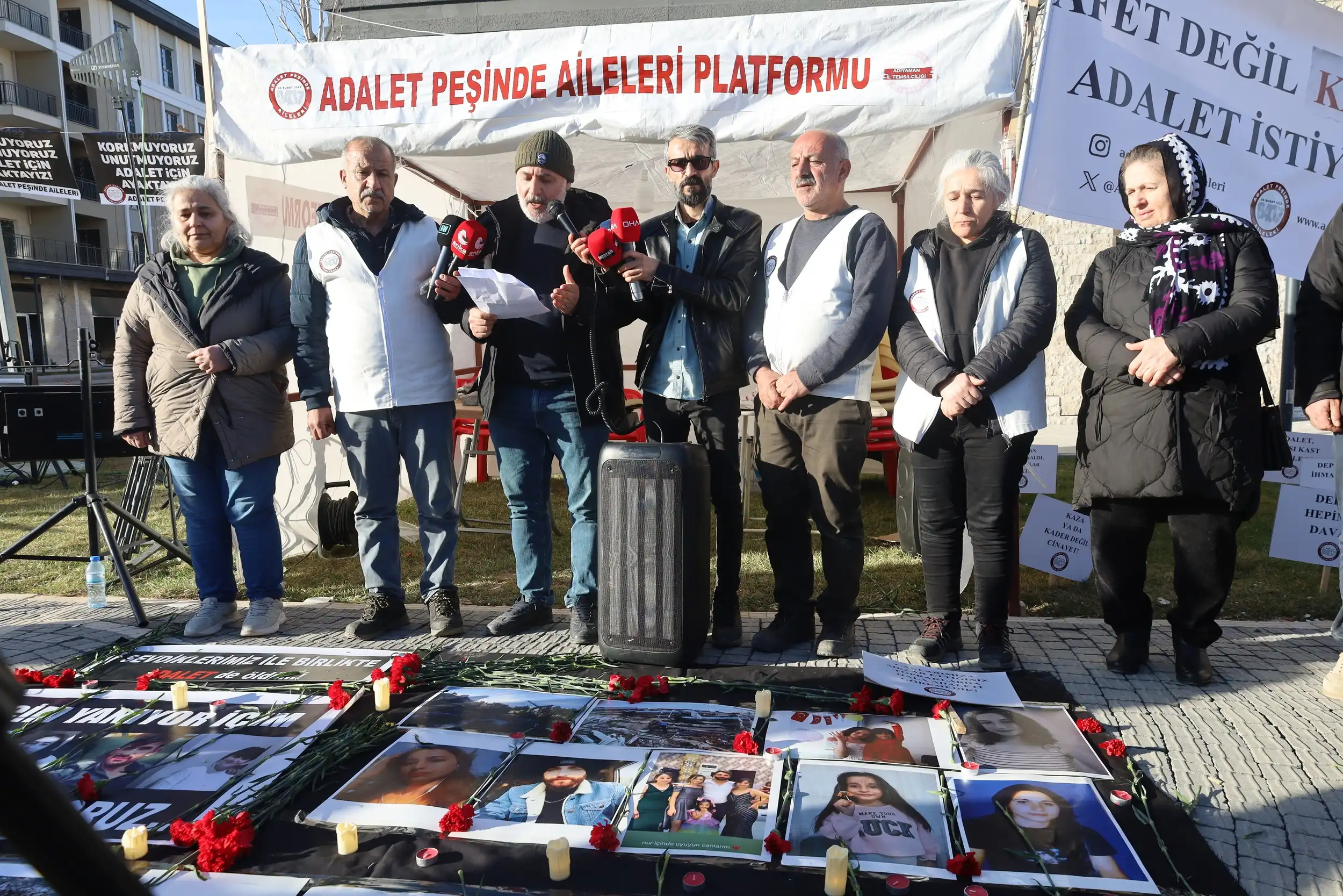 “Failler belli adalet nerede”, “Deprem değil ihmal öldürdü”, “Lütuf değil olası kast istiyoruz” dövizlerini etraftaki çimenlere koyan aileler, “Afet değil katliam. Adalet istiyoruz” pankartını açtı. Aileler adına basın metnini Adalet Peşinde Aileler Platformu Semsûr Temsilcisi Celal Gezer okudu. Unutturmamak, affetmemek ve hesap sormak için alanda olduklarını belirten Gezer, “Bu depremde kimileri; annesini, kimileri babasını, kardeşlerini çocuklarını, eşini Kimileri de tüm ailesini kaybetti. Her biri bir can parçası, bir ana kuzusuydu. Bu acının tarifi mümkün değil” dedi.