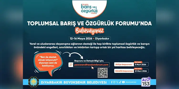 Amed Büyükşehir Belediyesi, yerel ve uluslararası dayanışma ağlarının katkısıyla 12-16 Mayıs 2026 tarihlerinde Amed’de “Toplumsal Barış ve Özgürlük Forumu” gerçekleştirecek. Forum, farklı toplumsal kesimleri bir araya getirerek ortak bir tartışma ve yol haritası oluşturmayı amaçlıyor. Forumun, kentten, bölgeden ve uluslararası alandan akademik çevreler, sivil toplum örgütleri, aktivist kurum ve gruplar ile sanatçıların katılımıyla düzenlenmesi planlanıyor.