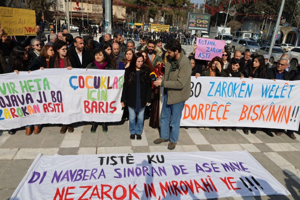 Açıklama sonrası “Bijî berxwedana Kobanê”, “Zarok jiyan aşitî” ve “Bijî berxwedana Rojava” sloganlarıyla DEM Parti Pirsûs ilçe örgütüne kadar yürüyüş gerçekleştirdi.