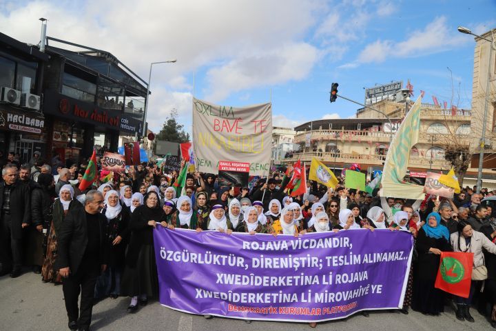Demokratik Kurumlar Platformu’nun çağrısıyla Mêrdîn’in Mîdyad (Midyat) ilçesinde bir araya gelen kitle, Kobanê’de devam eden kuşatmayı yürüyüşle protesto etti. Halkların Eşitlik ve Demokrasi Partisi (DEM Parti) İlçe Örgütü binası önünde aralarında Kürt, Arap ve Süryani yurttaşların olduğu kitle, çarşı merkezine doğru yürüyüşe geçti. “Bijî berxwedana Rojava”, “Bijî Serok Apo”, “Bijî berxwedana Kobanê”, “Bijî biratîya gelan”, “Yek e yek e yek e! Gele Kurd yek e” ve “Rojava, Rojhilat e, Kürdistan yek welat e” sloganlarının atıldığı yürüyüşte, Süryani Kadın Birliği, Bethnahrin Ulusal Konseyi flamaları ile Süryani ulusal bayrağı da taşındı.