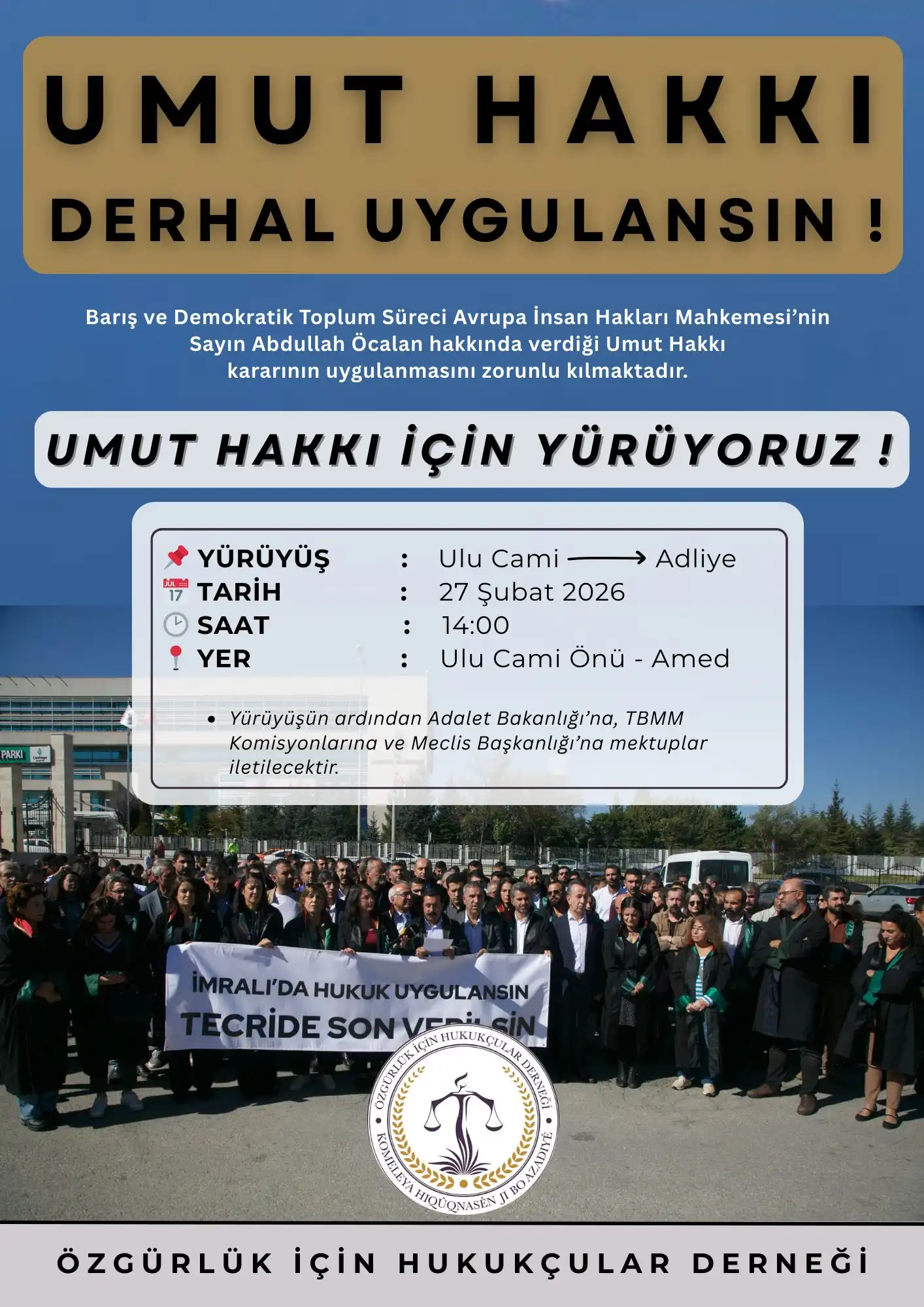 Özgürlük İçin Hukukçular Derneği (ÖHD) “umut ilkesinin” uygulanması talebiyle 27 Şubat’ta Amed’de yürüyüş düzenleyeceğini açıkladı. Sûr ilçesi Ulu Camii önünde saat 14.00’te başlayacak olan yürüyüş Diyarbakır Adliyesi önünde sona erecek. Yürüyüş ardından “umut ilkesinin” uygulanması için Adalet Bakanlığı, Meclis komisyonları ve Meclis Başkanlığı’na mektup gönderilecek.