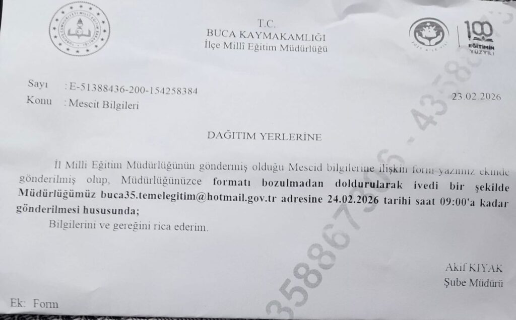 Buca İlçe Milli Eğitim Müdürlüğü, ilçedeki okullarda mescit bulunup bulunmadığına ilişkin bilgi istedi. İzmir İl Milli Eğitim Müdürlüğü ise ortaokul ve lise müdürlerine gönderdiği yazıda okullardaki kütüphane ve sığınakların kapatılarak mescitlere dönüştürülmesini istedi