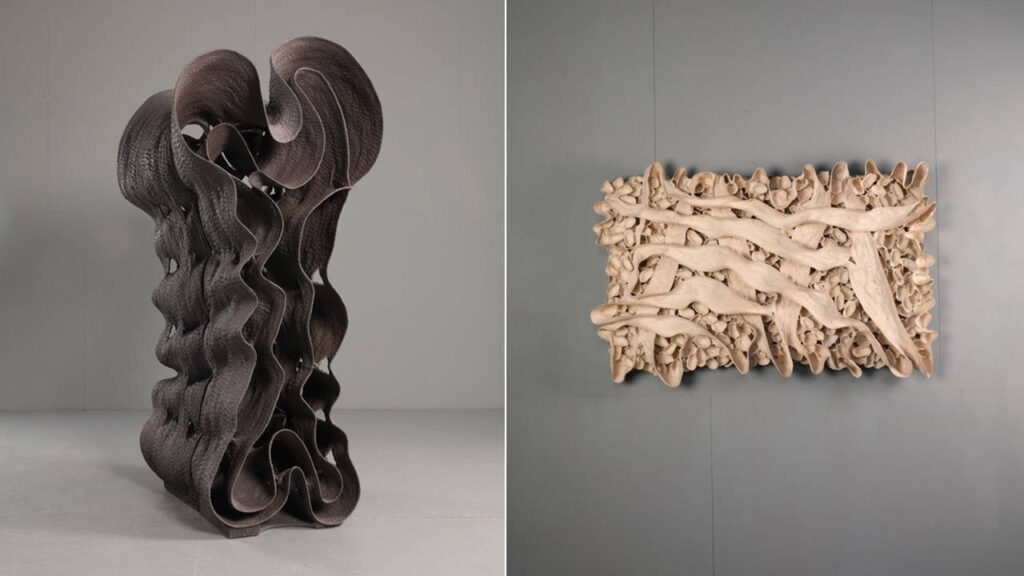 Duvar yerleştirmelerinde ise organik bir çoğalma hissi öne çıkıyor. Kemiksi, kabuksu, biyomorfik çağrışımlar taşıyan modüler yüzeyler; doğanın büyüme ritimlerini, tortuyu, birikmeyi ve zamana yayılan emeği hatırlatıyor. Eserler, mekâna göre genişleyen bir dil kuruyor; sanki her biri bulunduğu yere yeniden kök salıyor.