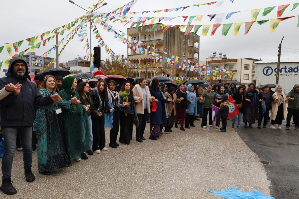Adana Demokratik Kurumlar Platformu, kentteki Newroz şölenlerine bugün de sağanak yağışa rağmen devam etti. Bugün Newroz şölenin adresi Yüreğir ilçesine bağlı 19 Mayıs Mahallesi’nde bulunan top sahası oldu. Sağanak yağış altında gerçekleşen şölende, Barış Anneleri Meclisi üyelerinin yaktığı Newroz ateşi etrafında halaylar çekildi, sloganlar atıldı.