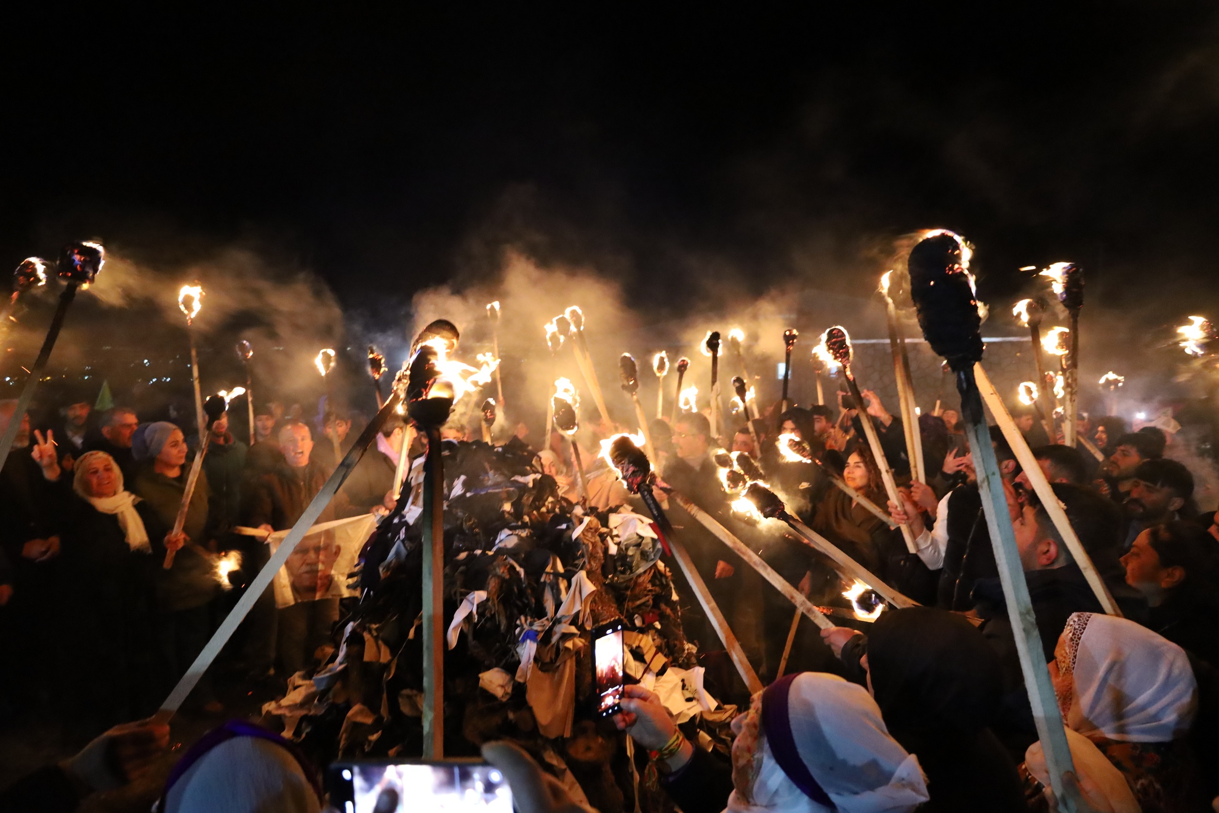 Ardından Barış Anneleri, Newroz ateşini “Bijî Serok Apo” sloganlarıyla yaktı. Kutlamada Newroz ateşi yakılarak etrafında halay çekilirken, gecenin karanlığı havai fişek ve konfetilerle aydınlatıldı.
