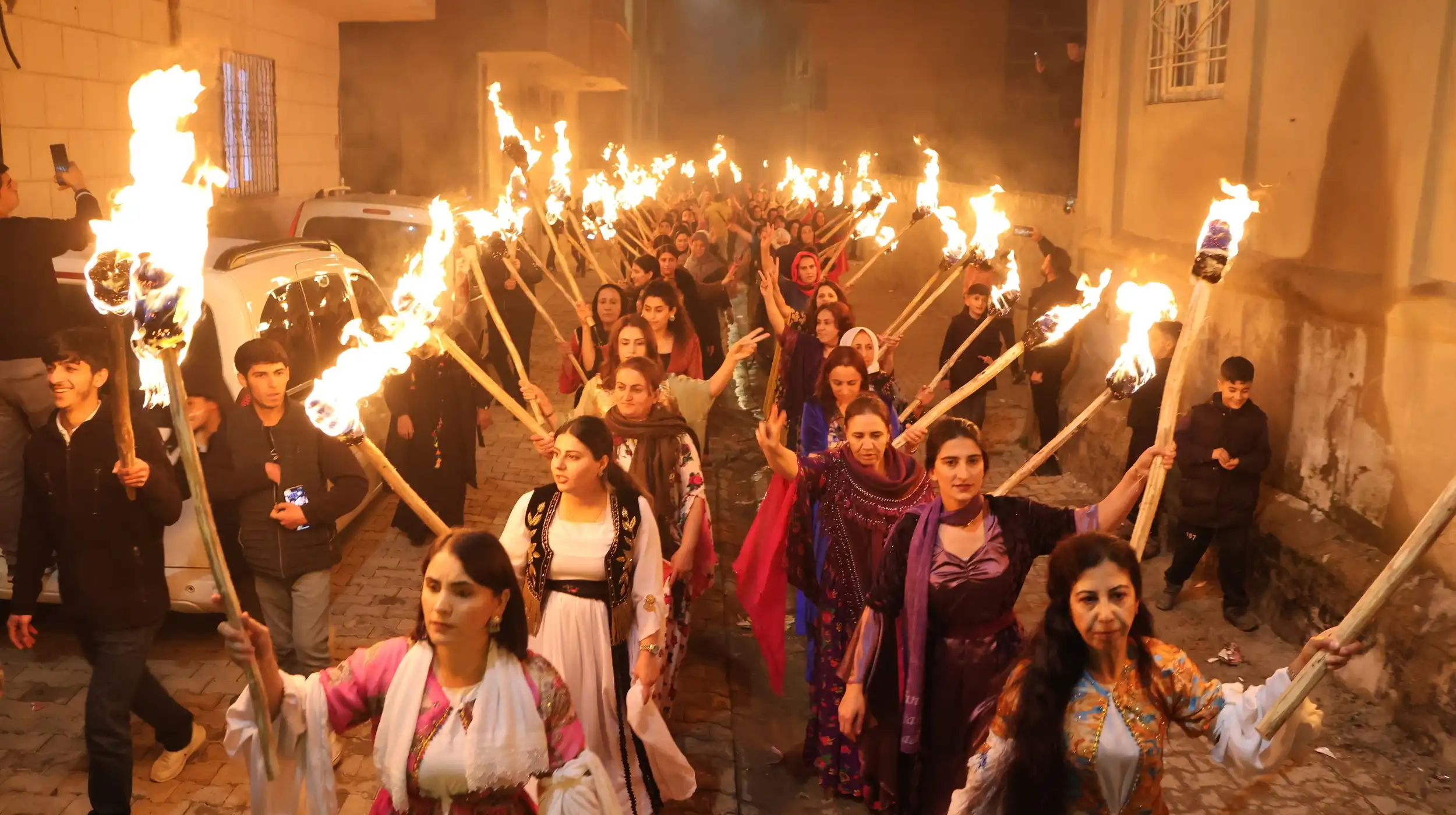 Şölen alanına yakın bir yerden kadınlar Kürt Halk Önderi Abdullah Öcalan’ın 77’nci yaşı için 77 meşale taşıyarak, şölen alanına yürüdü. Alanda kadınlar “Jin jiyan azadî” sloganı ve havai fişekleri ile karşılandı. Kadınlar yürüyüş esnasında sık sık “Bijî Serok Apo” sloganları attı. Newroz için yakılacak odunlar etrafında meşaleler ile çember oluşturan kadınlar, ateşi meşaleler ile yaktı.