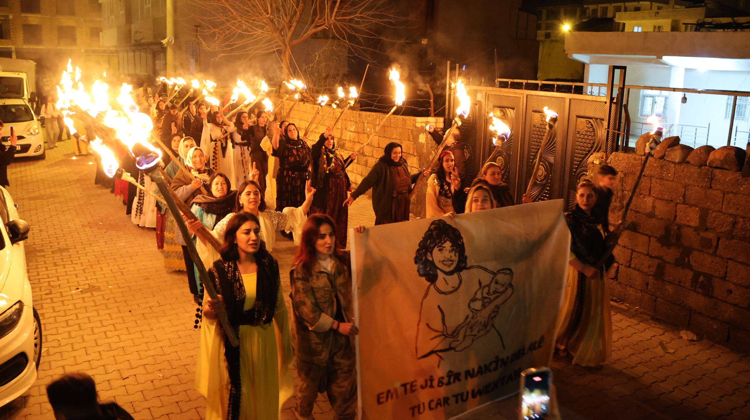 Halkların Eşitlik ve Demokrasi Partisi (DEM Parti) Hezex ilçe örgütü önünde bir araya gelen kadınlar, meşaleler eşliğinde kutlamanın yapıldığı alana yürüdü. Kadınlar yürüyüşte devletin Newroz kutlamalarına karşı düzenlediği saldırıları protesto etmek için 1992’de bedenini ateşe veren Rehşan Demirel’in posterini taşıdı.