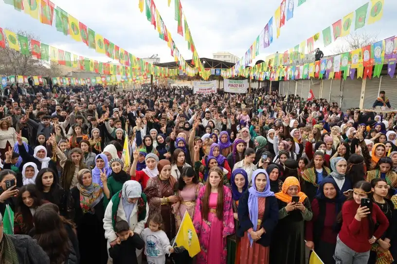 7’den 70’e yüzlerce kişi sarı, kırmızı ve yeşil renkli flamalarla alanı doldurdu. Ulusal kıyafetleriyle halaya duran yüzler, sık sık “Bijî Serok Apo”, “Rojbûna te pîroz be ey Serok Apo” sloganları attı. “Halillerin, Sultanların, Cumaların, Salihlerin, Nûjiyanların ve kahramanların ruhuyla; Mazlum’un ateşiyle Özgür Önderliğe” ve “Statûya Kurdî perwerdehîya Kurdî” pankartları alana asıldı.