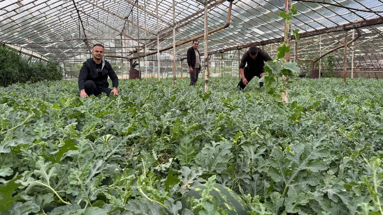 1.5 dönümlük seradan yaklaşık 8-9 ton ürün almayı hedeflediklerini belirten Dolu, “Aralık ayının 28’inde ektik. Şu an yavaş yavaş hasat zamanına başlayacağız. Karpuzları, ayın 15’i gibi kırmayı düşünüyoruz. Büyük umut var. Şimdi kışın yaza dönmesinden dolayı çok büyük umut var. Dışarılarda geç çıkacağı için camlarda (seralarda) şans var bu sene. Burada 8-9 ton gibi bir beklentimiz var, 1.5 dönüm serada. Günde üç sefer ektiğim mahsul için seraya girerim. Bir yerde solgun yer var mı, suyu ne zaman istiyor, ne zaman gübresi verilecek diye. Özellikle meyvenin tutum döneminde günlük gün aşırı 5 dakika suyunu veririz. Fazlasını vermeyiz. Hasat zamanı ise su miktarını arttırırız” diye konuştu.