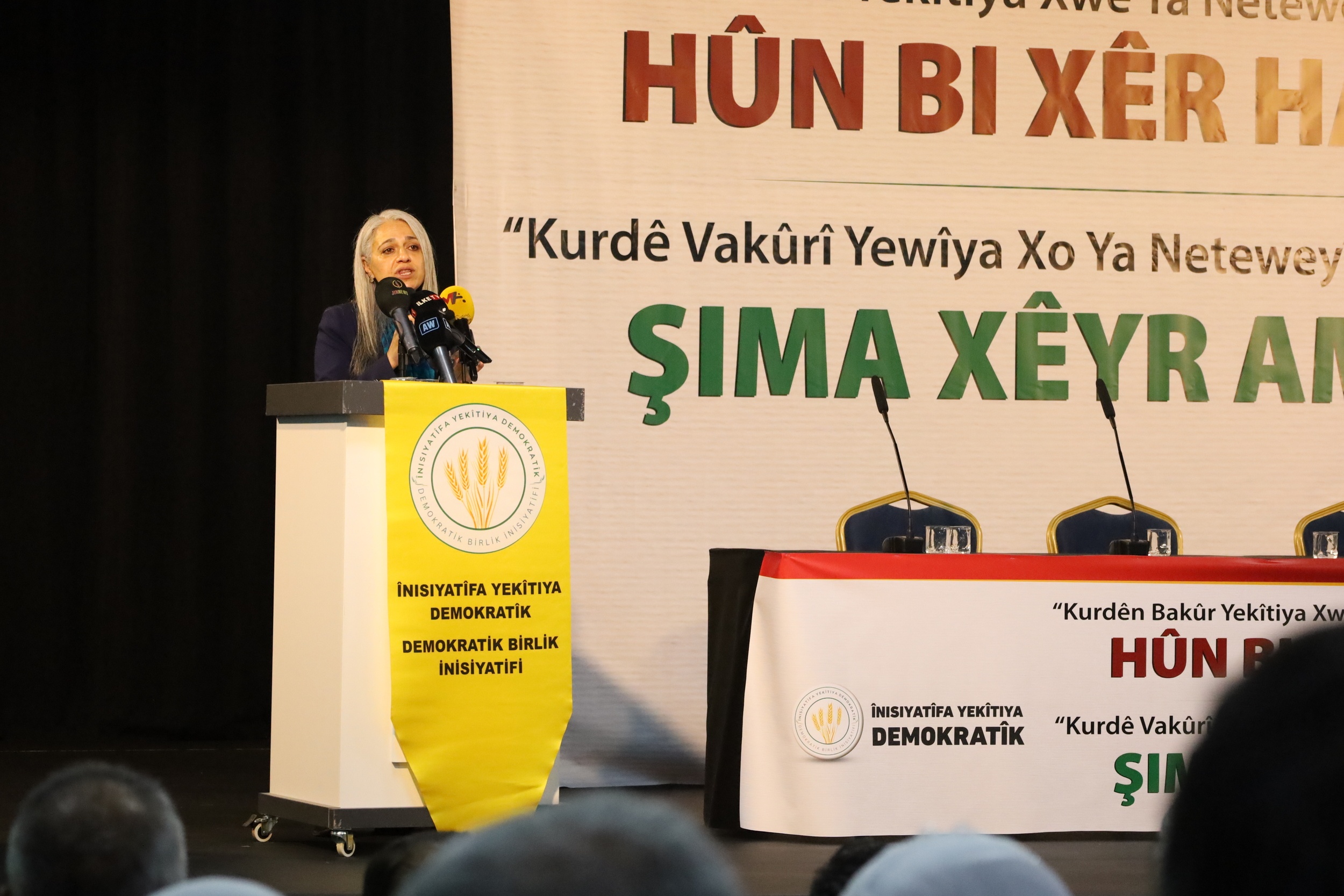 Demokratik Bölgeler Partisi (DBP) Eş Genel Başkanı Çiğdem Kılıçgün Uçar, Demokratik Birlik İnisiyatifi’nin, “Kurdên Bakur yekîtiya xwe ya neteweyî nîqaş dikin/Kuzey Kürtleri ulusal birliği tartışıyor” başlıklı konferansında konuştu. Konuşmasına Kürt dilinin önemine vurgu yaparak başlayan Çiğdem Kılıçgün Uçar, “Özgürlük hareketine çok müteşekkiriz ki kendi anadilimizde konuşuyoruz. Devlet, iktidar bizim dilimizi toprağın altına gömdü. Özgürlük hareketinin verdiği direniş ve bizim mücadelemiz bize dedi ki; ‘Diliniz değerlidir. Anadilinizde konuşun.’ Bu dil kendi yaşamını sürdürmeli. Türkçe konuştuğumuzda kendimizi çok eksik hissediyoruz” dedi.