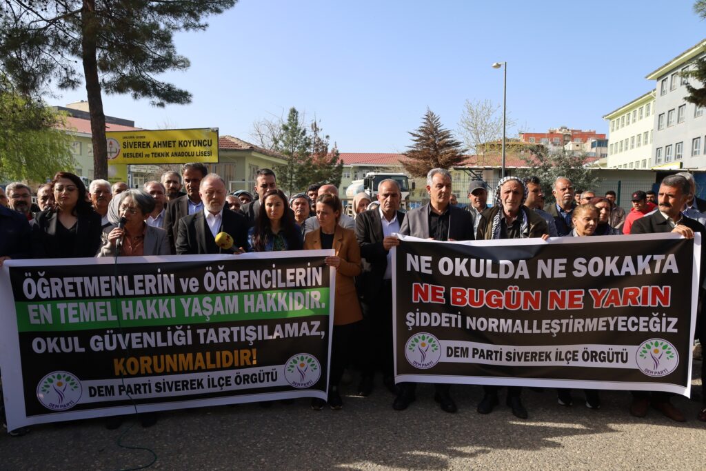 Heyet, okul binası önünde basın açıklaması yaptı. Açıklamada, “Ne okulda ne sokakta ne bugün ne yarın şiddeti normalleştirmeyeceğiz” ve “Öğretmenlerin ve öğrencilerin en temel hakkı, yaşam hakkıdır. Okul güvenliği tartışılamaz, korunmalıdır” pankartları açıldı. Açıklamada ilk olarak DEM Parti Eğitimden Sorumlu Eş Genel Başkan Yardımcısı İlknur Birol konuştu. İlknur Birol, 30 yıl boyunca eğitim kademelerinde çalıştığını belirtti. Son iki gündür okullarda yaşananların büyük bir alarm olarak gözüktüğünü ifade eden İlknur Birol, “Yaşananlar, bugün çocukların çocukları vurduğu ülke haline geldiğimizin göstergesidir. Art arda yaşadığımız iki olay çocuklara çocuklar tarafından kurşun yağdırıldığı bir iklimden geçiyoruz. Onlarca ölüm ve yaralıdan söz ediyoruz. Başka ülkelerde yaşanan ve televizyonlarda haber diye izlediğimiz şeyler hemen yanı başımızda yaşanıyor. Yıllardır eğitim sistemi üzerinde siyasi kaygılarla oyun oynayanların, eğitim sistemini sermayeye ucuz iş gücü olarak peşkeş çekenlerin, eğitim sistemini bir grubun inancına mensupları için kayrılma haline getirildiği siyasi zihniyetin sonuçlarını yaşıyoruz. Bu ölümler ve saldırılar asla münferit değildir. İnanılmaz derecede politiktir. Bir sonuçtur. Bu işin sorumluları var. Bunlar kendiliğinden olmadı” dedi.