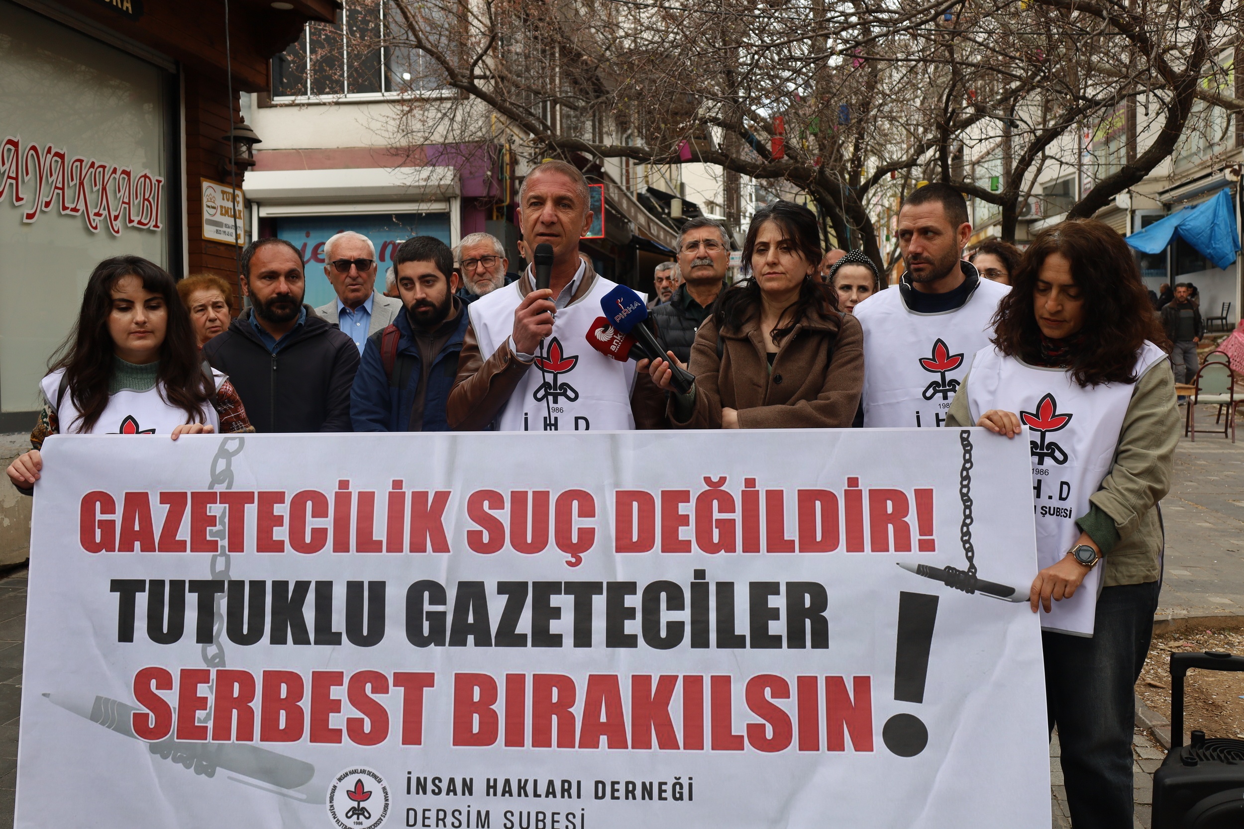 İnsan Hakları Derneği (İHD) Dêrsim Şubesi gazetecilere yönelik artan baskı, gözaltı ve tutuklamalara ilişkin basın açıklaması gerçekleştirdi. Sanat Sokağı’nda gerçekleşen açıklamaya, kentte bulunan sivil toplum örgütü ve siyasi parti temsilcileri katıldı. Açıklamada, “Gazetecilik suç değildir, tutuklu gazeteciler serbest bırakılsın” pankartı açıldı.