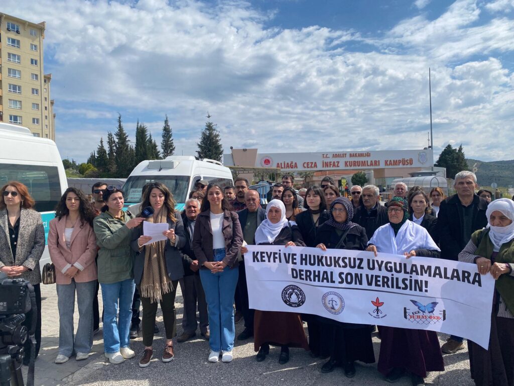Özgürlük için Hukukçular Derneği (ÖHD), Çağdaş Hukukçular Derneği (ÇHD) ve İnsan Hakları Derneği (İHD) İzmir şubeleri, Ege Tutuklu ve Hükümlü Aileleri ile Yardımlaşma Derneği, Aliağa’da bulunan İzmir Kadın Kapalı Cezaevinde yaşanan hak ihlallerine yönelik cezaevi önünde açıklama gerçekleştirdi. “Keyfi ve hukuksuz uygulamalara derhal son verilsin” pankartı açılan açıklamada, basın metnini ÖHD İzmir Şubesi Eşbaşkanı Fatma Demirer okudu.