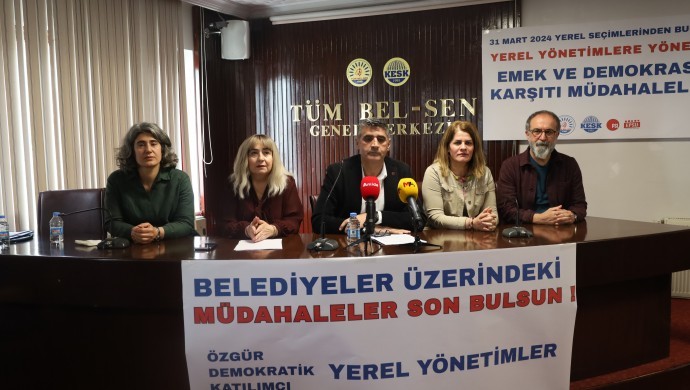 Tüm Bel-Sen, yerel seçimler sonrası belediyelere yönelik müdahalelere ve kayyım uygulamalarına dair düzenlediği basın toplantısında, ‘Avrupa Yerel Yönetimler Özerklik Şartı istisnasız bir şekilde uygulansın’ dedi