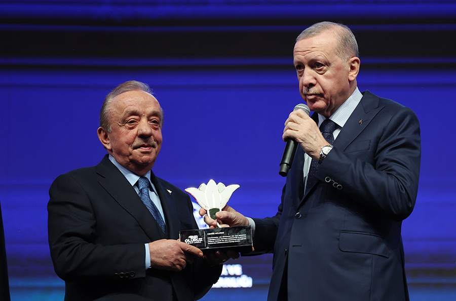 Cumhurbaşkanı Recep Tayyip Erdoğan, Adıyaman Gençlik ve Spor Müdürlüğü Spor Salonu’nda düzenlenen “Bir Oluruz 6 Şubat Depremleri Anma Programı”na katıldı. Cumhurbaşkanı Erdoğan, 6 Şubat 2023’teki Kahramanmaraş merkezli depremlerin ardından bölgede inşa ve ihya çalışmalarına katkı veren, farklı alanlarda faaliyet gösteren kurum, kuruluş ve özel sektör temsilcilerine plaket verdi. Cumhurbaşkanı Erdoğan, Cengiz Holding Yönetim Kurulu Başkanı Mehmet Cengiz’e de plaket verdi. Programda İçişleri Bakanı Ali Yerlikaya ile Çevre, Şehircilik ve İklim Değişikliği Bakanı Murat Kurum da yer aldı. ( TCCB / Murat Kula – Anadolu Ajansı )